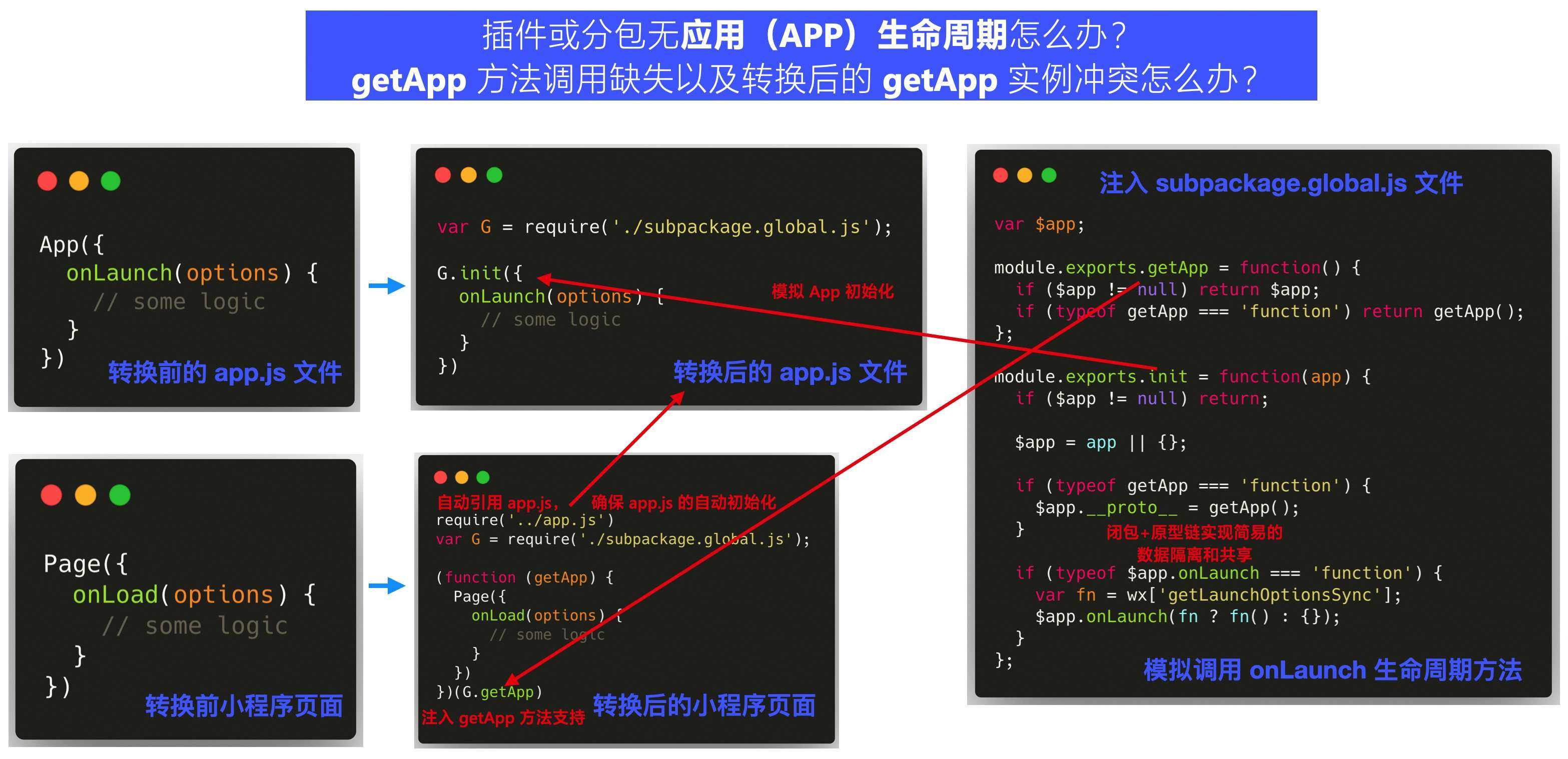 通过在小程序插件和小程序分包模式下增加 app.js 入口文件的支持,并模拟 App 生命周期调用和为所有的页面和组件注入 getApp 方法来实现,具体可参见下图示例: