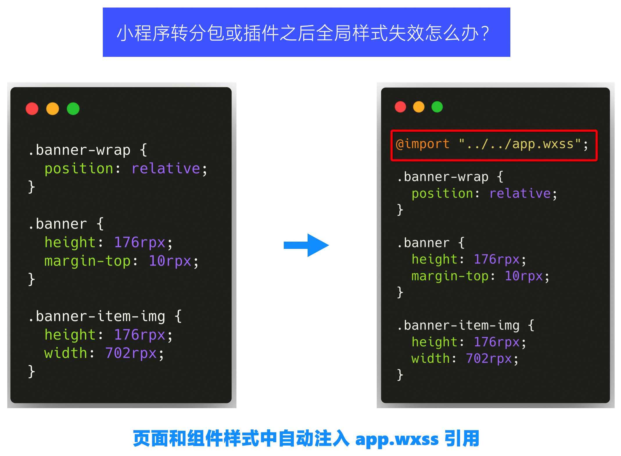 小程序编译时通过自动将全局样式文件(app.acss 或 app.wxss 等)注入到每个页面和组件的样式文件中作为引用来实现对全局样式的兼容,具体可参见下图示例: