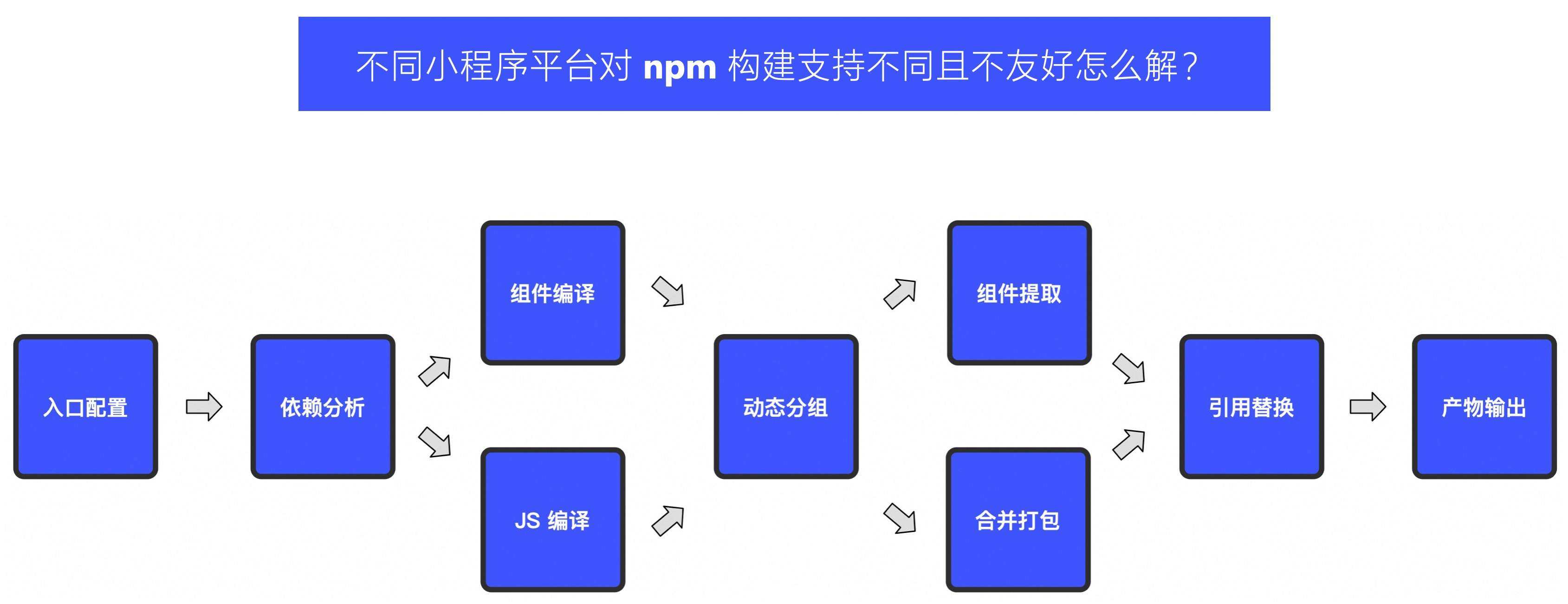 基于 MorJS 本身提供的 bundle 模式,结合 多端组件库规范 和 JS 依赖库规范 来自动在编译的过程中,自动将小程序、小程序插件、小程序分包的 JS 依赖统一打包并将使用到的组件库自动提取到 npm_components 文件夹来规避不同形态下的依赖问题以及不同小程序平台本身的 NPM 支持差异问题,编译流程如下: